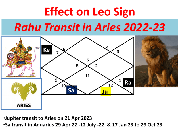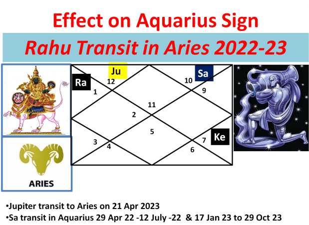 Jupiter will be in transit in 6th house till 21 Apr 2023. Saturn will be in 5th house aspecting Rahu during the period 29 Apr 2022 to 12 July 2022, and then 17 Jan 2023 to 29 Oct 2023. Saturn aspect on 7th house indicate issues in partnership, married life till 21 Apr 2023. Saturn aspect and Jupiter placement in 6th house is not a good combination as it indicates some health issues regarding digestion. Saturn delays the digestion and Jupiter in 6th house increase the desire to eat food. So health issues come up. Those who have control over eating habits, they may have very limited effect.